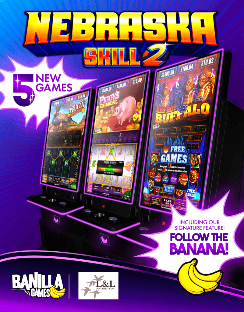 Nebraska Skill 2 offers variety and flexibility for operators and locations, and all titles showcase the new “Prize Slider Skill Feature,” as well as the classic “Follow the Banana Feature.” The Prize Slider appears after every winning turn and Follow the Banana is optional after any play turn including a winning or losing turn.